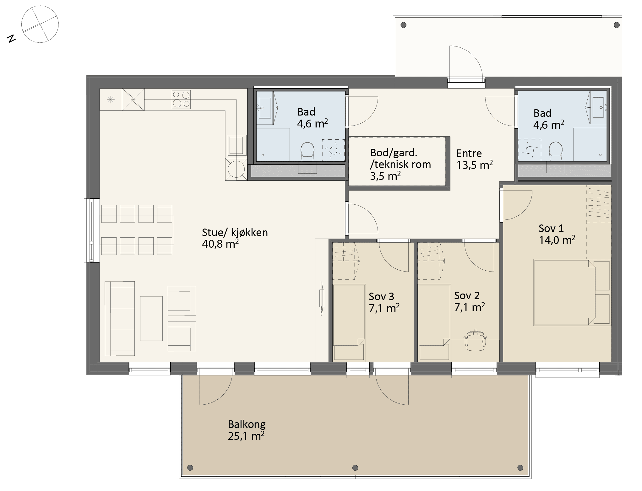 Her er rikelig med plass og muligheter. Stor entré med garderobeplass, 2 komplette baderom, bod og hele 3 soverom. Stue/kjøkken på hele 40 kvm. og rikelig med lys fra to sider. Prikken over i-en er en balkong på 25 kvm. med vakker utsikt og sol til sent på kveld.
