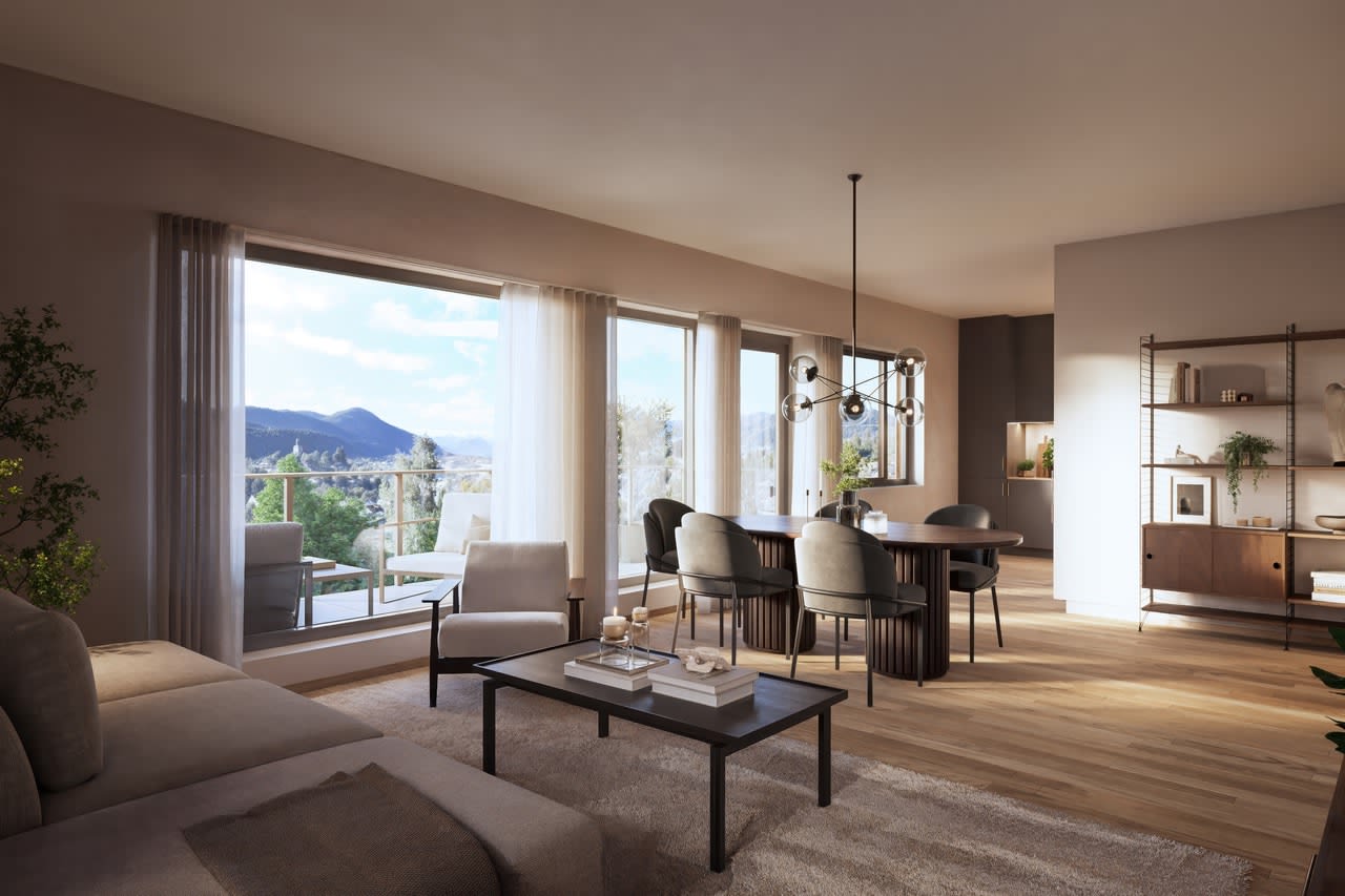 Kongsbergs fineste utsikt? Herfra kan du se skibakken, Knutefjellet, kirken, fossen og sentrum. Og du har solen til den går ned bak fjellheimen. Alle leiligheter har én eller to private uteplasser og mange er forberedt for innglassing slik at du har muligheten til å kunne bruke balkongene gjennom større deler av året.