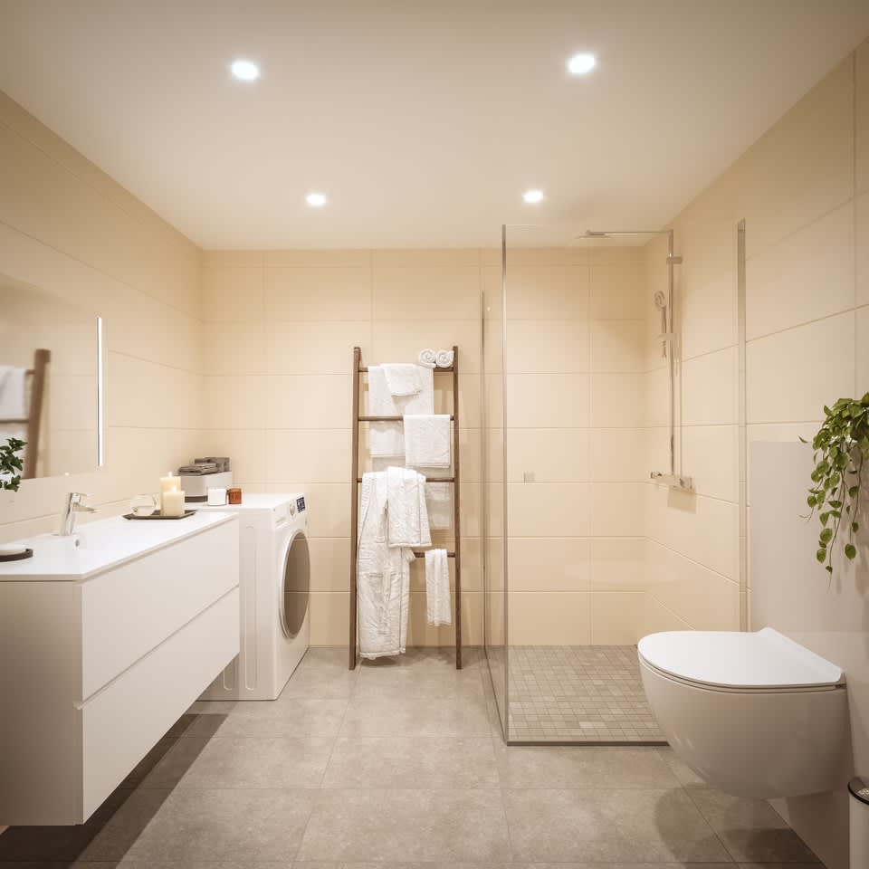 Ønsker du ett eller to baderom? Eller bad og et ekstra gjestetoalett? Alle hovedbadene har dusjnisje og opplegg for vaskemaskin og tørketrommel. Flislagt og med varmeklabler for en god og varm start på dagen.